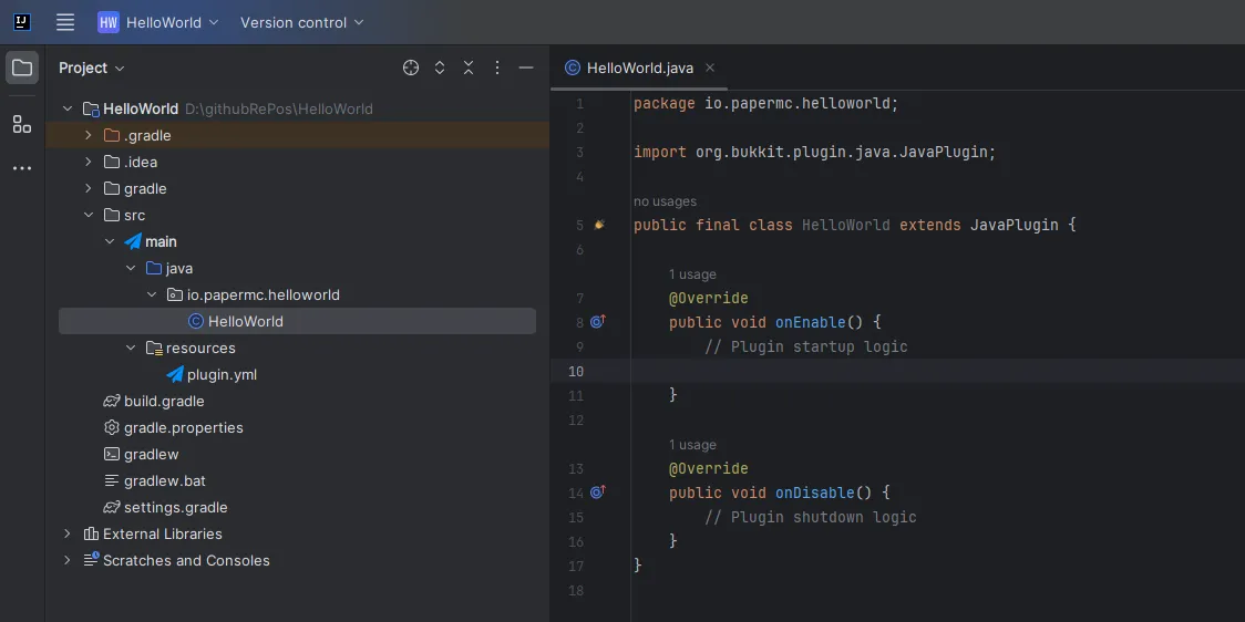 @EventHandler public void onPlayerJoin(PlayerJoinEvent event) { event.getPlayer().sendMessage(Component.text("Hello, " + event.getPlayer().getName() + "!")); }}Setting up the resources